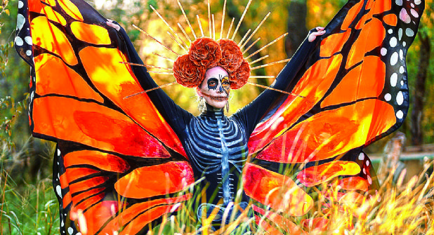 Con sus hermosas alas pintadas a mano por los artistas plásticos Victoria García y Chacho Díaz, la catrina monarca está lista para celebrar el día de Muertos.