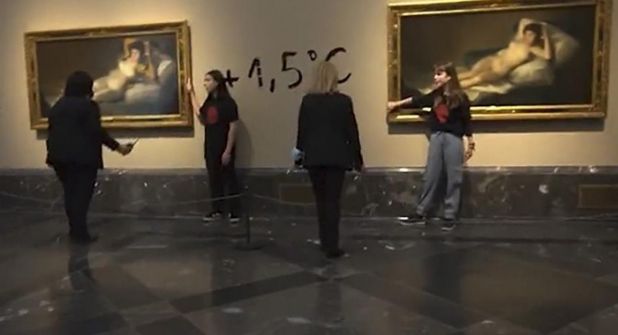 Fueron dos participantes de la organización Futuro Vegetal se pegaron hoy a los marcos de los cuadros de La maja vestida y La maja desnuda, obras del pintor español Francisco de Goya, en el Museo del Prado de Madrid. A su vez, marcaron en la pared "+1.5°" en referencia al anuncio de la ONU sobre la imposibilidad de cumplimiento del Acuerdo de París.
