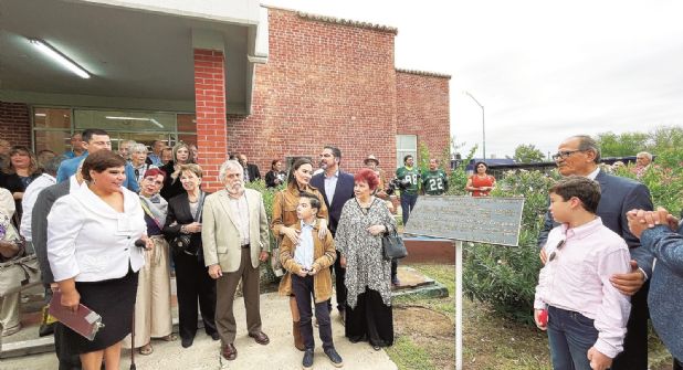 Juan Leonardo Sánchez Cuéllar, en compañía de su esposa Lupita Bello de Sánchez, hijos y nietos, develó una placa conmemorativa en la entrada del emblemático Edificio Rojo.