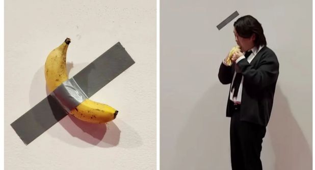 El arte ha acompañado al ser humano y esta obra, de nombre "Comediante", de Maurizio Cattelan trataba de un plátano colocado con cinta en la pared, aunque un estudiante coreano se comió la fruta, terminando así con la obra.