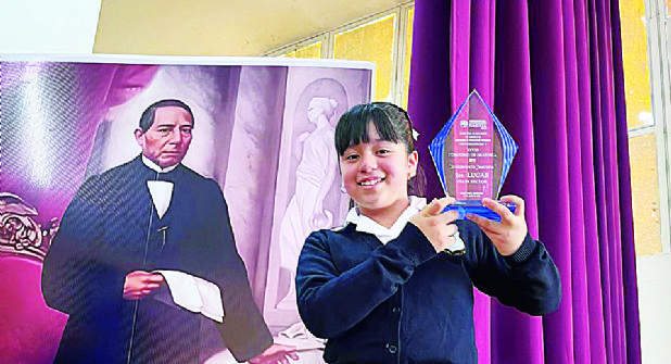 Alexa Naomi Araujo Rocha, alumna de la Escuela Primaria Arquímides Caballero Caballero, se alzó con el trofeo del primer lugar del XXVIII concurso de oratoria “Sentimiento Juarista”, en su etapa de sector.