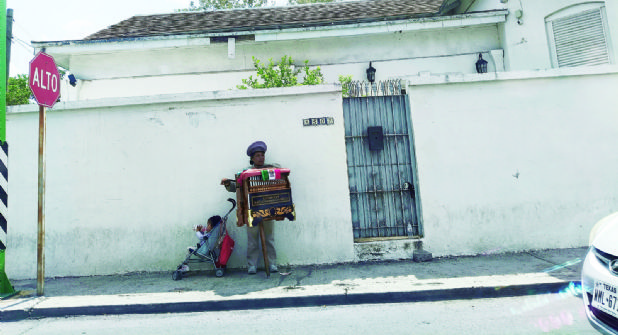 Una mujer gira la manivela del organillo en el crucero de calle González y avenida Iturbide, en Nuevo Laredo; a su lado, su pequeño hijo, de apenas unos meses, permanece sentado alimentándose en el portabebé mientras su esposo recolecta algunas monedas con los automovilistas.