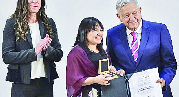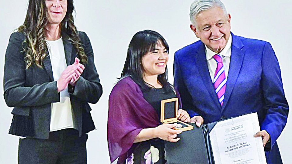 La tapatía Alexa Moreno recibe de manos de Andrés Manuel López Obrador la medalla que la reconoce como la mejor atleta del año