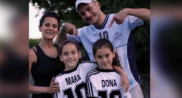 Walter Gastón Rotundo y Stella Maris Prez, padres de Mara y Dona, rinden culto y admiración al más grande futbolista de todos los tiempos en cada rincón de su casa. Además, él tiene tatuado en su espalda el momento en que el ‘Pelusa’ conoció a sus gemelas.