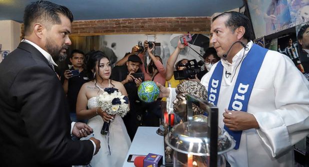 Hoy domingo se realizó la primera boda de la iglesia maradoniana en México, con una pareja que rinde fe a Diego Armando Maradona, el fallecido astro de futbol argentino y uno de los mejores jugadores de todos los tiempos.