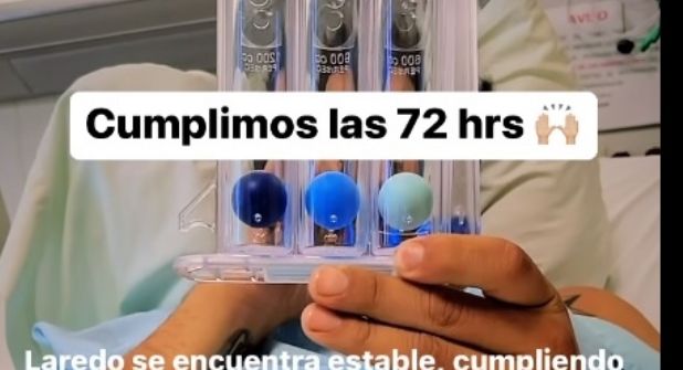 "Cumplimos las 72 horas", dice en la publicación. "Laredo se encuentra estable, cumpliendo con las órdenes del médico; el día de hoy está con más energía y su intestino comienza a dar signos de función.