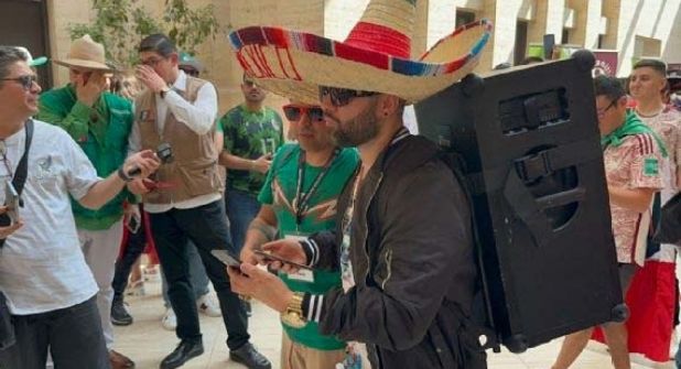 Un mexicano está causando sensación en Qatar desde su misma llegada al aeropuerto, repartiendo alegría y contagiando las ganas a bailar a los turistas y locales con una enorme bocina a todo volumen que carga a su espalda.
