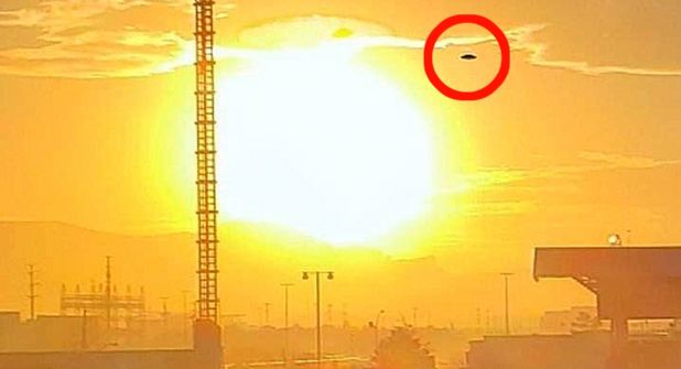 La foto muestra un sol amarillo brillante de invierno que comienza a ponerse detrás del Estadio Olímpico Benito Juárez, con el centro de El Paso a la derecha del estadio ubicado junto a la frontera. Un primer plano de una pequeña mancha oscura junto al sol parece un platillo volador.
