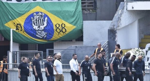 Edinho, hijo de Pelé, y el exjugador Zé Roberto cargaron el ataúd, ayudados por personal del equipo Santos, hasta una carpa situada en el centro de la cancha donde los familiares directos del jugador podrán tener un espacio privado para velarlo.