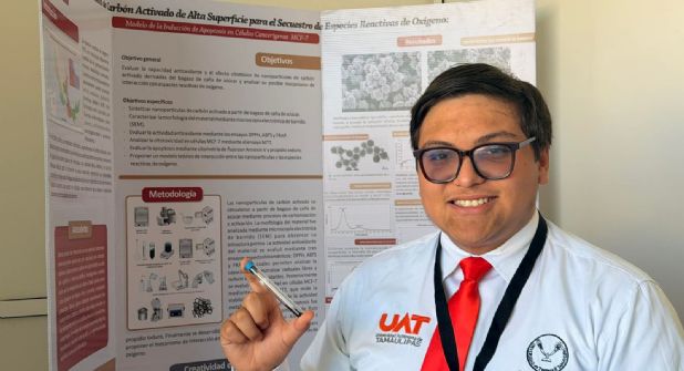 El alumno de la Escuela Preparatoria Mante de la UAT presentó con éxito su proyecto enfocado en la síntesis de nanopartículas de carbón activado, una línea de investigación aplicada al estudio de procesos asociados al cáncer.