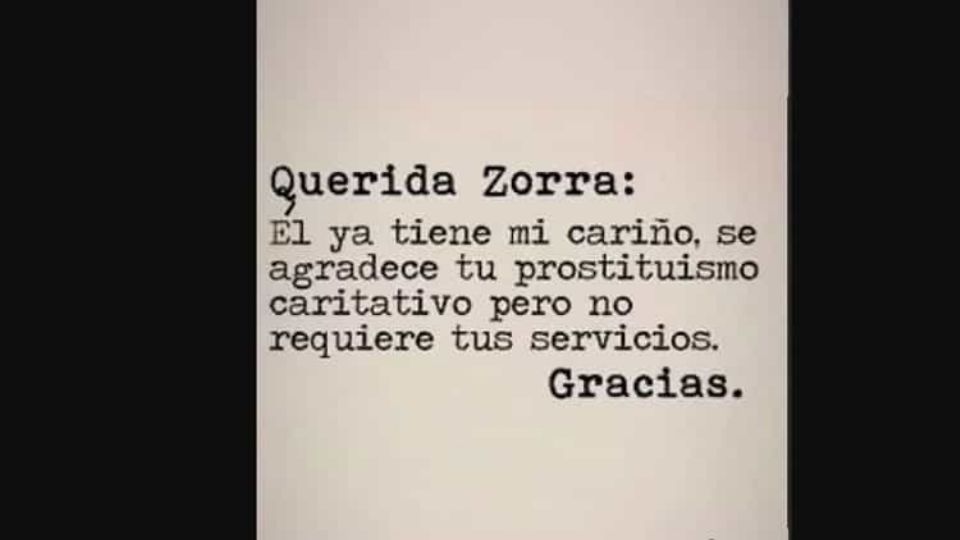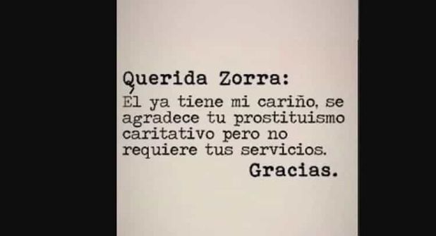 Querida zorra: Él ya tiene mi cariño, se agradece tu prostituismo caritativo, pero no requiere tus servicios, gracias”.