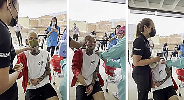 Un joven youtuber con la mitad del cuerpo tatuado tenía terror de aplicarse la vacuna covid-19 por lo que varias enfermeras tuvieron que hacer equipo para poder inyectarlo.