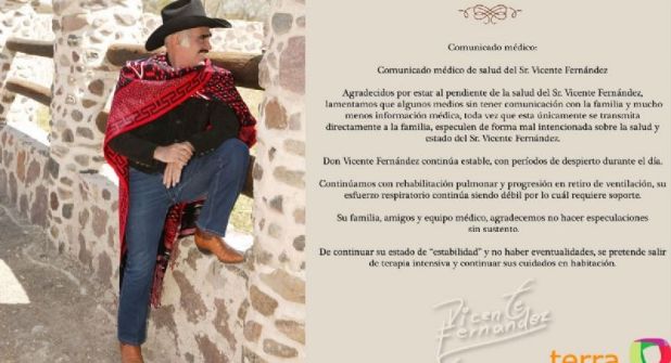 El Charro de Huentitán ha publicado en sus redes sociales un comunicado de prensa en donde se explica que la salud de “Don Chente” se encuentra estable, pero que ha demostrado una mejoría pues por periodos despierta durante el día, se sabe que continua en terapias de rehabilitación pulmonar y progresión en el retiro de ventilación. sin embargo su respiración continúa siendo débil y requiere de soporte.