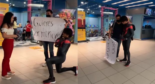 El video del joven disfrazado de Spider-Man que declaró su amor a su amiga ha causado opiniones divididas en las redes sociales, pues mietras unos opinan que el gesto realmente fue un acto de presión social para obligar a la chica a aceptar, otros se conmoviieron por la respuesta negativa y calificaron al sujeto como 'soldado caído'.