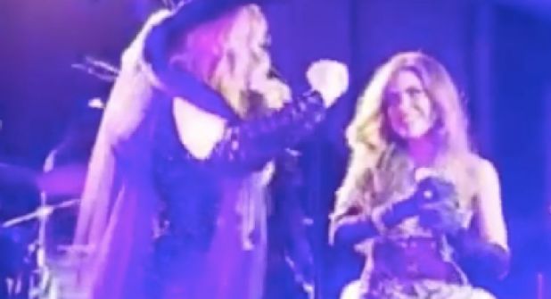 Cuando está por terminar la canción Gloria Trevi se acerca de nueva cuenta a Lyn May, estrecha su mano y le planta tremendo beso.