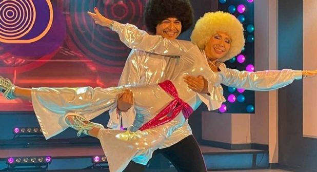 La conductora salió a bailar con su maestro coreógrafo, luciendo un palazzo de color blanco satinado muy entallado, tenis de colores y una cinta rosa a manera de cinturón.