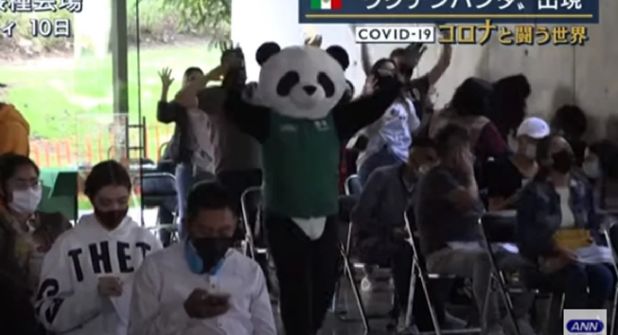 "Aparece un panda en la sala de seguimiento del sitio de vacunación en México. Se dice que es la mascota Pandemio la que fomenta la vacunación. El disfraz de panda animó a los que terminaron la vacunación a hacer ejercicio", explica el medio japonés.