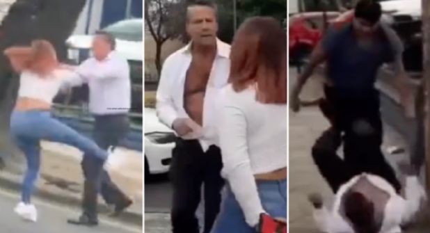 Alfredo Adame pelea con mujer en la calle; termina dos veces en el piso