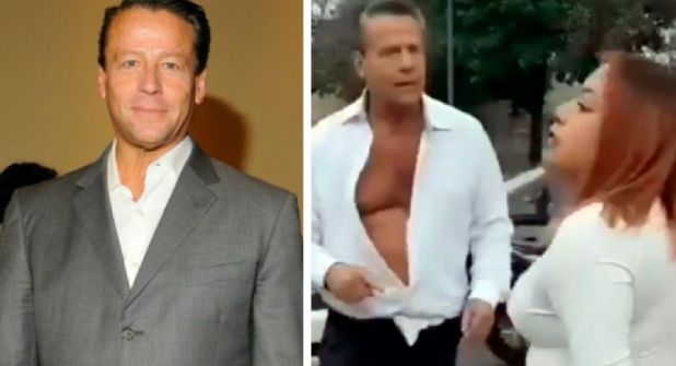 Alfredo Adame pelea con mujer en la calle; termina dos veces en el piso