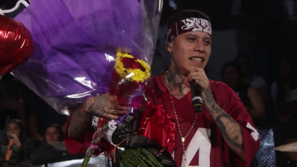 Con jersey rojo y jeans holgados, el rapero mexicano tuvo una exitosa noche en Nuevo Laredo en la que cantó todos sus éxitos, fue muy consentido y puso a cantar y a bailar al público.