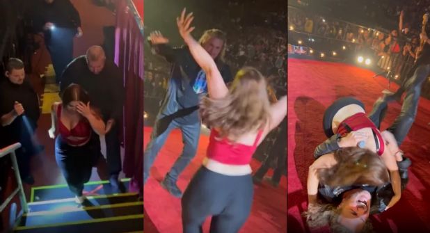 En el clip que circula en la internet, se ve cómo la mujer es invitada a subir al escenario para convivir con el vocalista, sin embargo, ella no pudo contener la emoción y terminó 'tacleando' al líder de la banda.