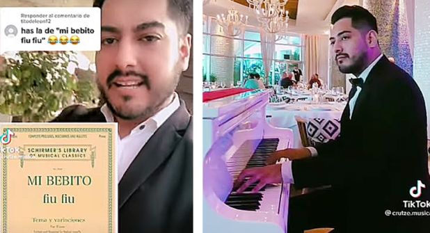 Un pianista mexicano sorprende en las redes sociales tocando temas populares como "Mi Bebito Fiu Fiu" y "El Ansioso" del Grupo Marrano en sitios exclusivos y caros.
