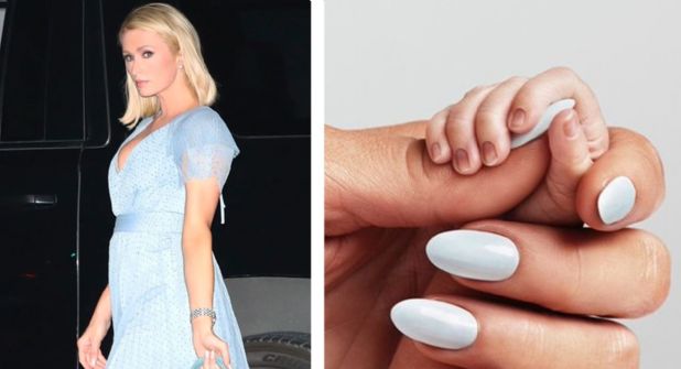 En la primera foto de su hijo, las uñas de Hilton se ven perfectamente cuidadas y pintadas de azul claro, y su pequeña envolvió con seguridad su mano alrededor del pulgar de su madre.
