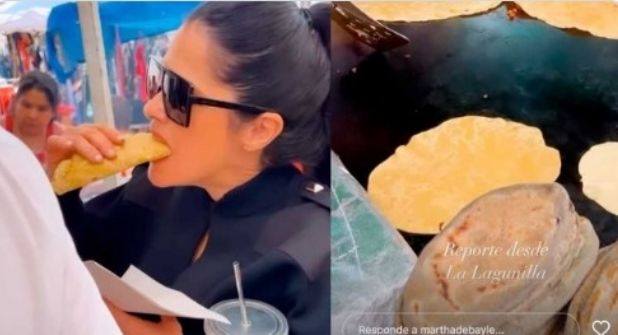 La conductora, quien hace unos días subió un video de como 'ponerle calcetines a las latas de refresco' que según ella son muy feas, fue captada comiendo una quesadilla en un puesto en el barrio.