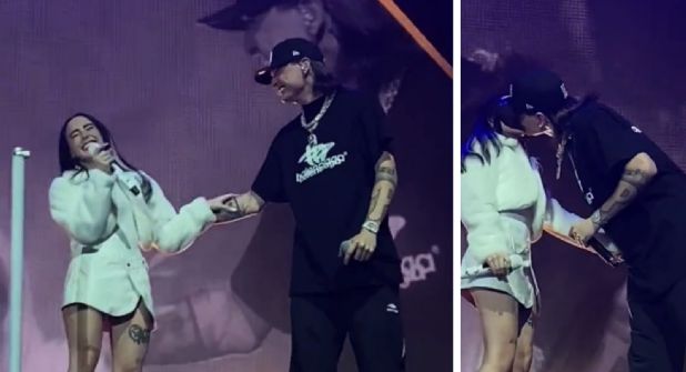 En medio de la canción, los dos jóvenes cantantes se tomaron de la mano y Peso Pluma emitió un mensaje a los miles de fans que acudieron al concierto, momento que la pareja selló con un beso que fue captado por miles de celulares y causó mucha polémica en las redes sociales.
