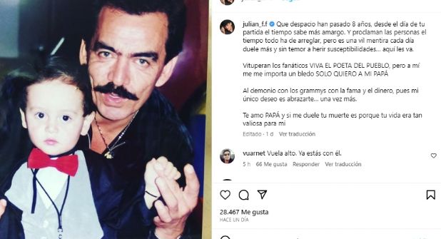 Más conmoción causó la noticia cuando en sus redes sociales, en su cuenta de Instagram @Julian_f.f, hay una publicación dedicada a su padre Joan Sebastian apenas un día antes de su fallecimiento.