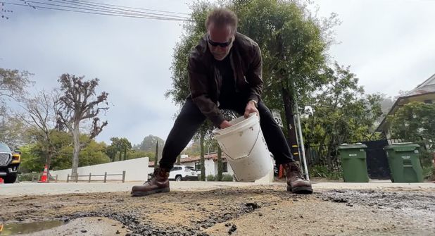El fornido actor publicó un video de las reparaciones de un enorme bache en Brentwood, algo común después de meses de lluvia en el sur de este estado que dejó a los trabajadores con una larga lista de pendientes.