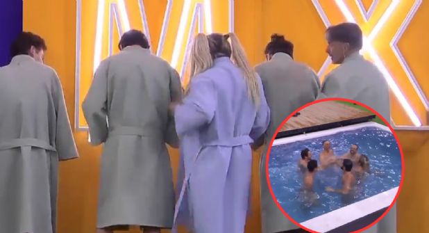 El equipo integrado por Sergio Mayer, Wendy Guevara, Poncho De Nigris, Apio, Nicola y Emilio Osorio habían prometido la semana pasada que si Emilio y Sergio se salvaban de la expulsión de la casa, se aventarían a la alberca desnudos, solamente tapándose sus partes nobles con sus manos.