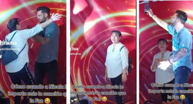 En ese momento se escuchaba la canción de Lefty SM, "Por Mi México". El rubio se movía en el escenario, cantando y grabando durante varios segundos. La mujer se quedó parada, sonriendo y esperando a que Nicola dejara de grabar para que la atendiera.