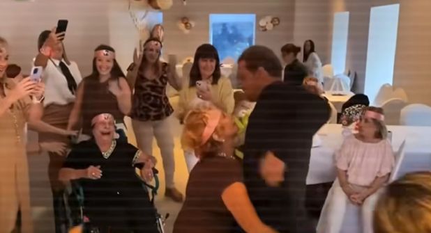 La abuelita más eufórica se acercó al imitador quitándole el saco y abrazándolo para después agacharse para aparentemente desabrocharle el pantalón, pero en ese momento una asistente más joven la separó del imitador y la fiesta continuó.