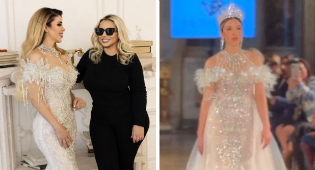 Desde hace días la diseñadora April Black Diamond compartió videos y fotografías del detrás de cámaras del evento de moda, en los que se observa a Emma Coronel con el vestido en una sesión de fotos y ensayando su paso por la pasarela.