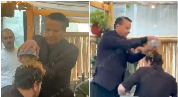 Adame agarró un plato de arroz, estilo yakimeshi y se lo tiró en la cabeza. La reacción del afectado fue al segundo y lo amenazó de golpearlo. El polémico actor, por su parte, se limitó a regresar a su mesa, sentarse y provocarlo: “¿Quieres más?”, dice.