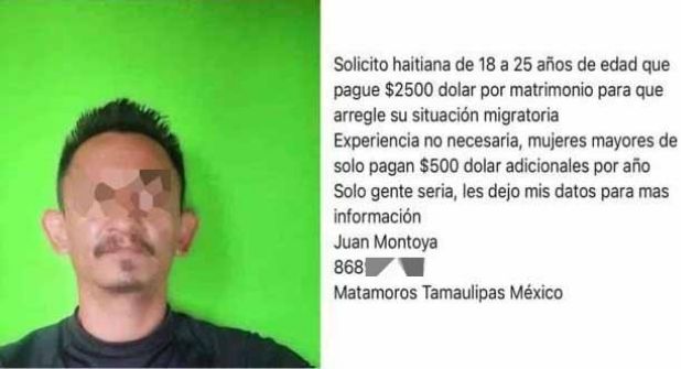 "Solicito haitiana de 18 a 25 años de edad que pague dos mil 500 dólares por matrimonio para que arregle su situación migratoria", escribió a través de los grupos de venta.