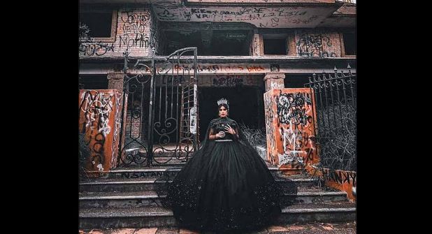 Su atuendo, ya extraño por ser de color negro cuando la mayoría opta por colores pasteles en tonos tenues... lo sorprendente fue su idea de querer usar esa mansión abandonada como parte de su sesión de fotos.