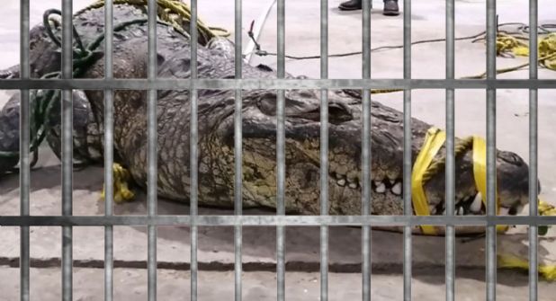 El cuerpo de Bomberos y Protección Civil llegaron y con la ayuda de varas y sogas capturaron al enorme cocodrilo. Ha decir de las autoridades este lagarto es de aproximadamente 3 metros de longitud y de más de 400 kilos de peso.
