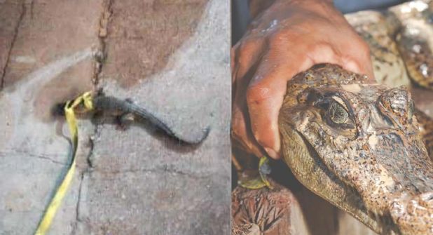 Se trata de una cría de cocodrilo, fue encontrada por veladores que estaban realizando rondines de vigilancia. La cría apenas tiene 60 centímetros de longitud.
