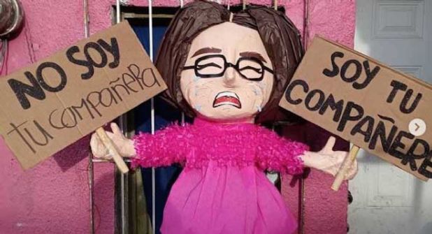 La piñata representa a una persona con vestido rosa sosteniendo dos carteles en los que se lee “no soy tu compañera, soy tu compañere”.