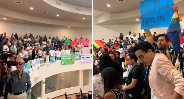 Grupos religiosos y miembros de los grupos activistas a favor de los derechos de la Comunidad LGBT+ se confrontaron en el Congreso durante la sesión para la reforma del Código Civil del Estado que permitirá el matrimonio igualitario en Tamaulipas.