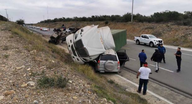 Una camioneta que transportaba a una familia de 5 integrantes sufrió un aparatoso accidente con un tráiler sobre la carretera Monterrey-Ciudad Victoria, el transporte de carga pesada quedó sobre el vehículo de la familia.