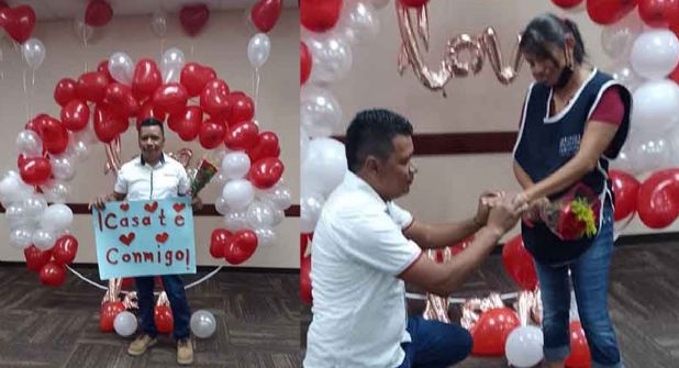 Fue así como con ayuda de sus compañeros de trabajo y del departamento de Recursos Humanos, este enamorado hombre logro organizar una elaborada y bien lograda propuesta de matrimonio, puesto que decoró el lugar para la ocasión especial, con un bonito arco de globos en colores rojo y blanco y un letrero en donde se puede leer la frase "¡Cásate conmigo!.