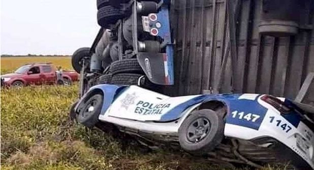 Un tráiler aplasta a una patrulla. El pesado camión terminó de costado encima de una patrulla de la Policía Estatal en el Libramiento al Ejido Francisco Villa en San Fernando, Tamaulipas.