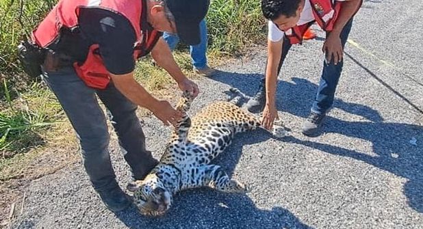 Un jaguar murió sobre la carretera después de que fue atropellado el pasado fin de semana, sobre la carretera federal Soto La Marina-La Pesca, en Tamaulipas.