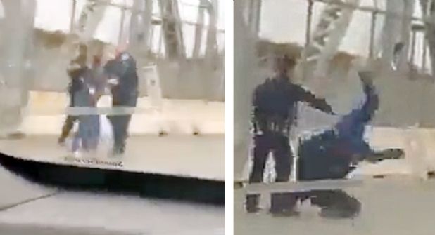 Usuarios que circulaban por el llamado Puente Viejo que une a las ciudades de Matamoros, Tamaulipas con Brownsville, Texas fueron testigos de la detención de una señora a quien un policía avienta contra el suelo. Los conductores acusan de brutalidad policiaca al agente de aduanas.