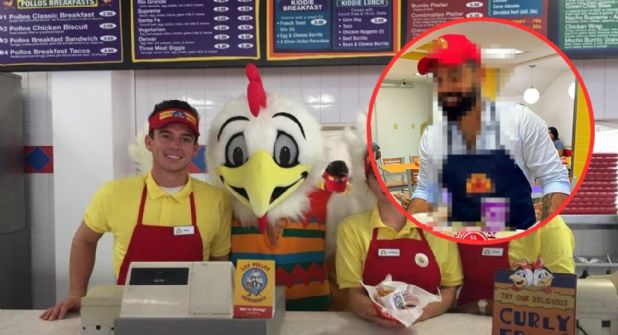 El hombre de la publicación aparece con la distintiva gorra y mandil del restaurante “El Pollo Loco”, mientras carga una charola, simulando que entrega una orden, lo que causó furor entre las féminas que vieron el posteo en Facebook del negocio de comida.