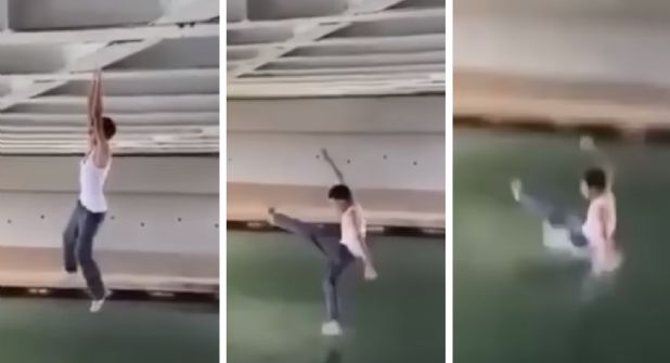 En las redes sociales se han hecho virales varios videos de jóvenes que sí han conseguido cruzar el canal, pero en esta ocasión uno no pudo sostenerse justo a la mitad de la estructura y, tras tambalearse, cayó.