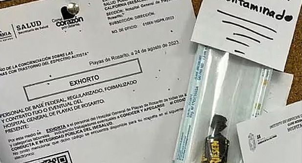En las imágenes originales se observa un pizarrón que tiene un documento presuntamente con logos del estado de Baja California.